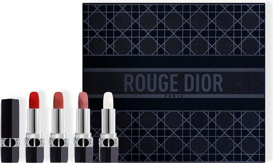 Per questa edizione esclusiva, Dior ha messo insieme tre rossetti e un balsamo per le labbra dell'iconica linea Rouge Dior. Sono riuniti in una scatola di velluto blu notte ispirata all'iconico motivo Couture Cannage della Maison Dior. Uno specchio è integrato nella scatola.